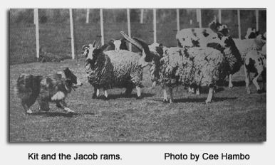 “It took Kit and me ten minutes!! All the man wanted was to be able to bring the sheep into a smaller pen with a shelter over it and catch them. He had several groups of 20 head in long, narrow fields and a flock of 80 to 100 head of wild Barbados in a ten acre field. The first pen I sent Kit in had about 20 head of Jacob rams. Have any of you had much experience with these? Well, I hadn’t until then. Kit went on down to the far end and started to lift them. All 20 rams turned front and center to challenge. I