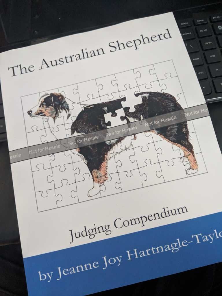 The Judging Compendium is unlike other efforts that have come before it to explain the breed standard, terms, and locomotion mechanics. Australian Shepherd specific, Compendium takes the academic and blends with the practical. As someone who was raised in the show Aussie world first, I know that a lot of times, the explanation of what is ideal is generalized without practical knowledge. Phrases like “can trot all day” stick with you and create an emphasis on show ring gaiting – and specifically ground covering stride with as much reach and drive as is possible becoming an ideal. She turns that idea on its head: “An Australian Shepherd with a sound, balanced trot should translate into an Aussie that can outmaneuver livestock. The trotting style is not choppy or stilted, but not long and flowing either. The trotting style is moderate. It has to be” (83). From my own experience really testing my dogs, I’ve seen that what might win in the breed ring isn’t necessarily what allows a dog to live into its old age still sound and enthusiastic about doing its job – I think this is truly the main message Hartnagle-Taylor wishes to convey. It has been a journey of education for me, and she’s hoping to short cut that for others. It starts with the choice of photos and illustrations: many of the images are familiar to you if you’re a reader of her prior works and she’s chosen mainly older photos for a reason – rather than embracing the progression of the breed in the show ring or what is in favor for the Aussie type today, she wants to emphasize what the early dogs looked like and why that remains an ideal. Her choice of visuals will set in mind for many what an ideal, functional Aussie looks like. Rather than focusing heavily on what’s seen in the show ring, she uses almost no stacked photos to illustrate points, choosing a variety of types to illustrate her points, and lots and lots of movement (and I don’t mean flying trots) shots to emphasize her explanations. You will see dogs flying through the air, confronting cattle, and dipping low to heel – and you’ll understand what the mechanism is involved to allow them to do that. There is NO other book out there that I know of that does this. She compares the ASCA and AKC breed standard and pulls no punches when it comes to how the two standards deviate and what the effect on the dog can and is becoming because of it. You’ll understand why word choice makes a difference and why choosing to fault something or not is important. For non-judges or those without a lot of hands on experience, there is SO much here to learn and she makes it easy to see in your own dogs. You’ll connect to the historical dogs she mentions while seeing things in your own dog and deepening your understanding of the form that follows the function. She has quizzes at the end of each chapter that are not simply intended to test what you learned, but make you stretch and truly process what you’re learning, asking questions. Because of this, I hope that it becomes a standard used for judging clinics as it fosters great discussion and deeper thinking. I imagine that a great number of show breeders and handlers will take umbrage to some of her assertions, but my hope would be that they are open to the message – because many of us are not going to see an Aussie working practically on a ranch. Much of what’s described in the book isn’t something you can see from watching a dog at at trial, even on cattle. It isn’t until you really have to test your dog with miles on uneven and challenging terrain that you truly know what you have. It is so easy to live in a self-imposed bubble of what is correct because everyone around you thinks it is. It’s my deepest hope that this book challenges people with those ideas to either find opportunities to see this in real life or trust in those opinions that have walked the walk. While the production value isn’t as high as if this had been done by a traditional publishing house, the amount of work the author put into this is obvious. Hartnagle-Taylor has done what a lot of us have attempted to do in the past – truly illustrate the breed standard in the context of the breed’s use and functionality – but in making it a book, heavily illustrated with diagrams, technical terms, and more, she’s leaving a lasting legacy for the breed. This is a book aimed at preservation of the breed for all its finest qualities – and it does an exceptional job of making its point. This is a document that should be in every serious Aussie person’s library. We are fortunate to have it.