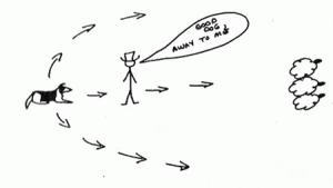 Some novice handlers don’t put enough aggressive body posture into it because they fear that their dog will always look as unhappy about leaving the sheep as he does the first time you do this. They don’t want to make their dog unhappy — not even for a second. This is NOT the right altitude you want to project. You MUST move at the dog like the aggressive pack leader you want him to think you are! If you do it right you can eliminate months of training and nagging and often, intense frustration with a dog that could lead to a blow up of the trainer’s temper — which can result in worse things happening to the dog.